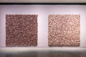 . Here landscape is reborn not as an optical encounter but as textural immersion – an ironic reversal of the reflectors primary purpose to aid vision. Inspired by the pink salt lakes of south eastern Australia, hinted at in the Catalan subtitle which translates as Pink Lagoons, Marti has manipulated the circular perfection of each reflector to craft textures redolent of the crystalline salt endemic to the lakes. (It’s no accident that they also resemble mis-shaped Baroque pearls.) Pink lakes are hyper-saline environments with the pink hue is caused by a type of bacteria, defined as being by its very nature extremophile as it thrives in environments that others cannot tolerate. The salt content and volume is also a register of this continent’s age – Marti as a recent arrival has a deep appreciation that he lives on ancient, unceded Country. Venturing into landscape as a non-Indigenous artist is far from uncomplicated and Marti brings to this new work his distinctive and abiding interest in intimacy. Marti offers us an experience that is deeply personal and however obscured or contorted through the arduous process of heating and manipulation, his customised reflectors remain ‘reflective’ of each of us and of our own experiences.