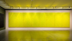 In Oh canola! Marti’s persistent muse of portraiture has given way to landscape. The eponymous work in the exhibition incorporates more than ten thousand vivid yellow customised reflectors, the type used on vehicles to aid visibility, on a field spanning ten metres. Uniting the languages of abstraction and landscape – arguably Australia’s most vexed and historically-laden genres – Marti recreates the sensation of the monumental field – the optical dazzle and the energising warmth of the golden canola. Engendering a type of synaesthesia, whereby we ‘feel’ colour and we ‘see’ sensation, Marti describes the works as possessing ‘a robust sense of themselves as objects and entities that are deserving of our attention’. They infuse the gallery with a yellow glow, shifting how we perceive space and reorienting us, just as our experience of landscape can.