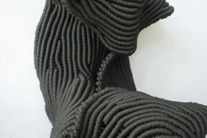 Marti’s own family history, specifically his father’s practice as a laparoscopic surgeon, is brought to bear in Natura Morte (Variacions en Gris i Vert) whereby melted Tupperware in variations of grey and green form a visceral interior landscape. Elsewhere in Nude, Marti’s reminiscences of a close friend – a fashion designer with a penchant for nude hues – take form as a suspended sculpture comprised entirely of ostrich feathers. Lurching from the gallery wall is Gàrgula. Like its namesake the gargoyle, it overlooks the landscape and is at once menacing and protective. Its body, woven rhythmically in uniform dark olive green ropes, resembles a type of armour. Marti’s cites his viewing of Samurai armour at the Metropolitan Museum in New York many years ago as a key source of inspiration and he has employed the same knot used in the body wrapping forms of the Samurai’s garments to create Gàrgula.