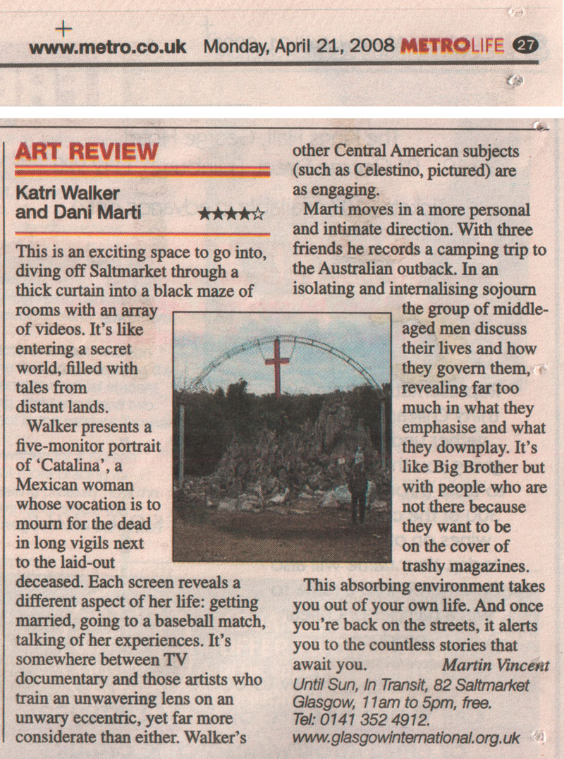 Walker presents a five-monitor . portrait of ‘Catalina’ a Mexican woman whose vocation is to mourn for the dead in long vigils next to the laid-out deceased. Each screen reveals a different aspect of her life: getting married, going to a baseball match, talking of here experiences. It’s somewhere between TV documentary and those artist who train an unwavering lens on an unawary eccentric, yet far more considerate than either. Walker’s other central American subjects are as engaging.