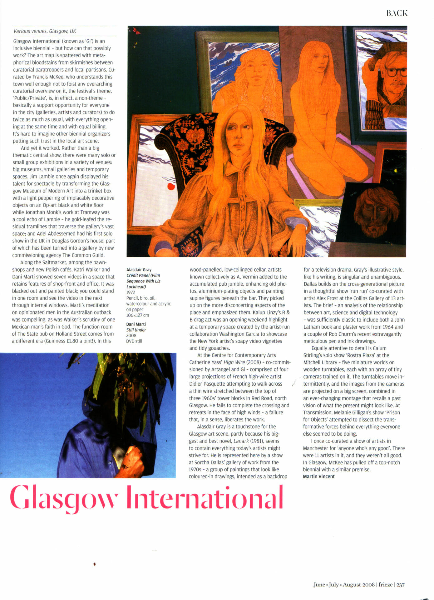 Along the Saltmarket, among the pawnshops and new Polish cafés, Katri Walker and Dani Marti showed seven videos in a space that retains features of shop-front and office. It was blacked out and painted black; you could stand in one room and see the video in the next through internal windows. Marti’s meditation on opinionated men in the Australian outback was compelling, as was Walker’s scrutiny of one Mexican man’s faith in God.